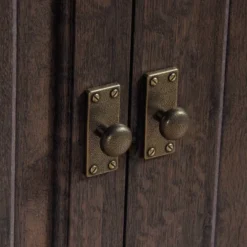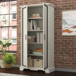 Looking to add a little extra storage to your home? We’ve got you covered! Create the additional storage options your home needs without having to sacrifice on the style that you love with this tall storage cabinet from the North Avenue® collection. Behind its two large doors, this storage cabinet with shelves offers ample space for all your things. It includes four adjustable shelves that can move to different heights to create flexible storage for items of all shapes and sizes. This 2 door storage cabinet provides you with all the room you need to stow away various household items like your collection of books or board games. It also includes a full upper shelf for larger items likes towels and spare blankets. It has room for all your things! Finished in Charter Oak™ and detailed with a durable, black metal base and hardware, this double door storage cabinet will have you feeling clutter-free in no time.