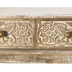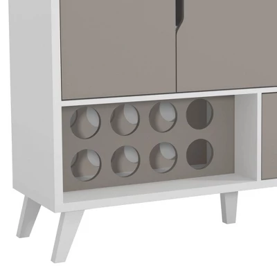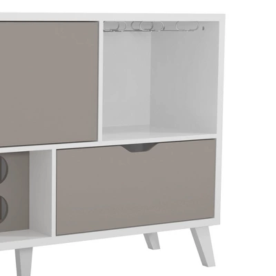 Impart a coastal touch to your living room, dining room, or den with this expertly designed Wine Bar Cabinet that can also serve as a TV media entertainment center console. With a built in wine rack with a bottle holding capacity of eight, it has an open compartment with convenient stemware hangers. Also featuring a smooth gliding drawer, the two cabinet doors open to reveal a spacious storage. Handcrafted from a premium quality composite wood frame, the white and neutral gray finish harmonizes with a wide variety of decor styles, easily elevating the room. The five support legs enhance the stability and durability of this piece so that it remains a faithful, reliable companion for years to come.