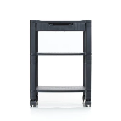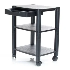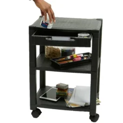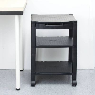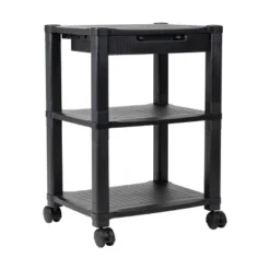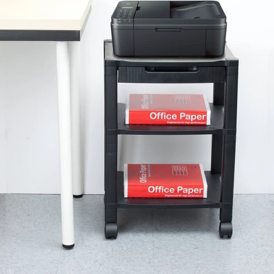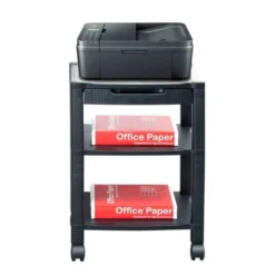 Save valuable space and gain mobility for your printer, scanner, fax machine, and any other office machine weighing up to 75lbs. Unit is small enough to fit under your desk. It will not only hold your machine, but help organize your desk as well. There are three shelves to help store all your office essentials.