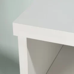 - Hidden storage behind doors features large adjustable shelf for flexible storage options.