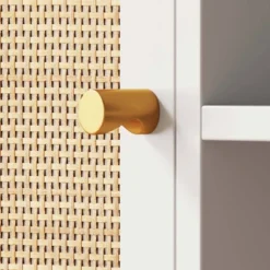 - Mina is a unique and modern TV stand with its rattan details of texture on its cabinet doors that gives this entertainment console a sleek boho-chic design.