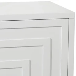 Adjustable shelving adds valuable storage to the stylish presentation of this two-door accent cabinet. Its door fronts feature a dimensional concentric square motif in a white finish that blends crisp, clean style to the piece. Round gold hardware delivers smooth, contrasting curves and a touch of warmth. Tapered block feet complete this stylish, modern design.