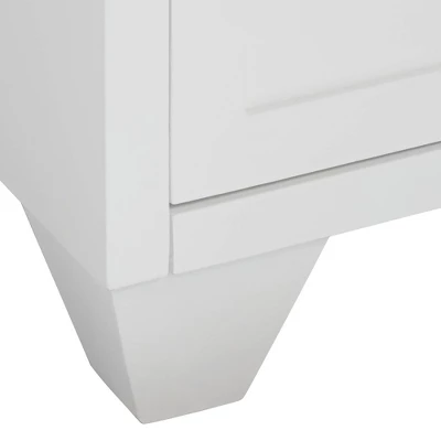 Adjustable shelving adds valuable storage to the stylish presentation of this two-door accent cabinet. Its door fronts feature a dimensional concentric square motif in a white finish that blends crisp, clean style to the piece. Round gold hardware delivers smooth, contrasting curves and a touch of warmth. Tapered block feet complete this stylish, modern design.