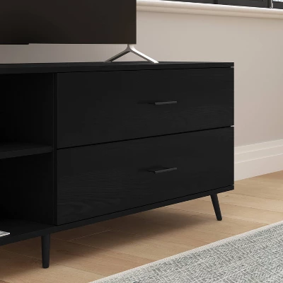 Retro style blends with 21st century functionality in this mid-century modern inspired media console. Durably constructed and designed with ample storage with adjustable open shelving and two drawers. A cable management hole helps to reduce visual clutter in your home for a neat, organized space.