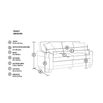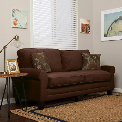 Enjoy functional style and plush, comfortable seating with the Serta Copenhagen 73 Inch Sofa. A great solution for smaller spaces, its compact size and easy tool-free assembly makes it an affordable and stylish seating solution for your apartment, condo or office. Soft rounded arms and pillowy back cushions bring traditional style to your living room, den or game room. Quality hardwood materials deliver strength and stability you can count on, while individually wrapped coils surrounded by high-density foam and poly-fibers provide comfortable seating you can sit back into. Designed to match pieces in the Copenhagen Collection, this Serta sofa can be combined with another sofa, loveseat and accent chair for a completely coordinated look.