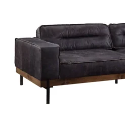 Part of the handsome Silchester Collection, this modern industrial sofa set will look great in any contemporary space. Contrast stitching makes the antique ebony top grain leather upholstery pop, and highlights the warm color of the wooden trim base. Metal spindle legs visually lighten the substantial proportions of this sofa set. Enjoy wide track arms and comfortable feather and foam seat construction, and relax in style.