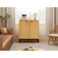 This 2-Doors cabinet and Black Metal Legs crafted with Bamboo material which brings a natural and environmentally friendly home feeling.This attractive work of art is a wonderful combination of 15mm thick bamboo adopts the engraving and milling technology to cut the wavy pattern,,ensuring a long life with perfect sustainable natural material and durability. The bamboo texture is clear and the color is soft, which can be matched with the bedroom, living room, and study.Being a considerate companion to your home decor,This cabinet keeping clutter under control effortlessly provides a perfect choice for you.Aash Collection are including with 2-door Cabinet,1-door Cabinet,3-Drawer Cabinet,2-Drawer Nigntstand,1-Drawer Nigntstand.