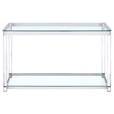 Create an elongated look with the bold metallic details from this clear sofa table. Complete with rounded acrylic legs, the sleek silhouette is full of glamour. Display sculptures or photos on the glass top or sleek built-in shelf. Celebrate a minimalist-inspired silhouette with the clear lines in the chic frame. Perfect for any modern or classic motif, this table is versatile and elegant.
