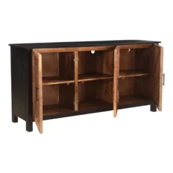 A corrugated horizontal pattern wraps around the sides and across the curved fronts of the two doors for an intriguing textural design that draws the eye, making this Credenza a dramatic focal point for any room. Finished in our Frisco Earl Grey Rub with custom oversized hardware and a spacious shelved interior, you will love not only the storage space, but also the sculptural touch this Credenza will add to your decor.