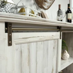 News flash – sliding barn doors are a must-have! Give your home the style it deserves with the trendy design and charming good looks of this credenza from the Barrister Lane collection. This entertainment stand accommodates up to a 60″ TV, making it the ideal spot to cozy up around and watch all-day movie marathons with your friends. Change things up and use its spacious top surface as a place to display your favorite home décor items like decorative plants, knick-knacks and photos of your family. This media credenza features hidden storage behind its two sliding doors so you can display the best and hide the rest. It includes three adjustable shelves that can move to different heights to create flexible storage options for items of all shapes and sizes. These shelves are perfect for video and gaming consoles or movies and board games. Its enclosed back panel includes cord access so you can keep all your wires neat and out of the way. Finished in White Plank, this one-of-a-kind TV credenza is just what your home needs.