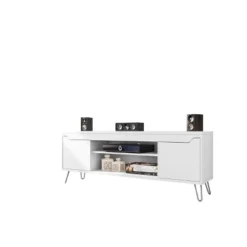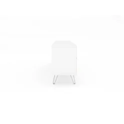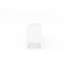 Finish off your space with the TV stand Mid Century Modern fans will appreciate and create the perfect living room entertainment mainstay for loved ones. Two center rectangular shelves store all your media accessories and essentials, while two concealed storage compartments keep things like books, magazines, or DVDs safely stashed away. With its clean lines, splayed metal feet, and sleek design, this piece will impress all your guests and become your best purchase.