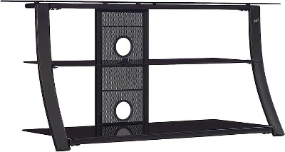 This contemporary audio video furniture with a scratch resistant high gloss black powder-coated steel frame and black tempered safety glass shelves is designed to hold most flat panel televisions up to 46″ plus up to four or more audio video components plus a center channel speaker. The CMS Cable Management System hides and organizes wires and the open architecture provides flow through ventilation.