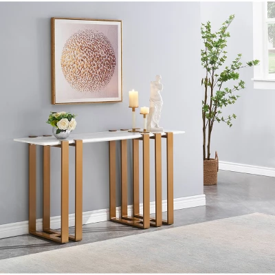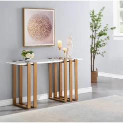 An abstract art lover’s dream, this console has an organic beauty, combining a Starshine white marble top and a geometric metal base in a soft gold finish. Every piece is unique due to the natural grey veining throughout the authentic marble tops. Sure to be a conversation piece in any living room.
