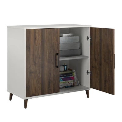 Add valuable and stylish storage to your home with the Room & Joy Berkhardt Accent Cabinet. The beautiful two-tone finish on the laminated particleboard gives the Cabinet a high end look at a fraction of the cost. Behind the 2 doors are 2 adjustable and 2 fixed shelves to store away board games, office supplies, or extra throws. Place a coffee maker on top to create a trendy mid-century modern coffee bar or put a printer on top for a stylish storage cabinet for your home office. The possibilities are endless with this versatile Cabinet. The Cabinet ships flat to your door and requires assembly upon opening. Two adults are recommended to assemble. Once assembled, the Cabinet measures to be 30.71”H x 31.65”W x 15.71”D.
