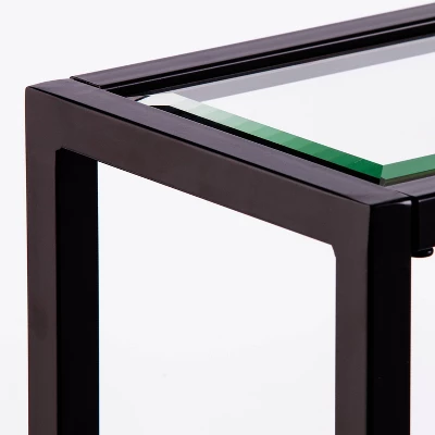 Display storage goes anywhere with the Aiden Lane Berton Narrow Metal Console. A long glass tabletop provides sleek display space for knickknacks and family photos, while the open shelf holds books or potted houseplants. The narrow profile slips easily behind your sofa or along a wall, maximizing small space storage in your home. Put your favorite items on display without sacrificing valuable space when you bring home this two-tier console table with glass.