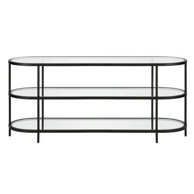 Combine functionality and on-trend design with this eye-catching oval TV stand. Its curved tempered glass top and shelves are offset by your choice of neutral metallic finishes. The clean lines of its steel frame instantly update your entertainment space, pairing perfectly with your modern living room or mid-century den.Features : Accommodates TVs up to 60″.Hand crafted Black Bronze finish is applied to the steel frame.Features a tempered glass top and shelves.Weight capacity is 65 lbs. on top, 30 lbs. on middle shelf, and 40 lbs. on bottom shelf.Features easy assembly.Clean with a soft, dry cloth; no harsh chemicals or abrasive cleaning materials.Specifications : Product Weight : 56.40 lbs