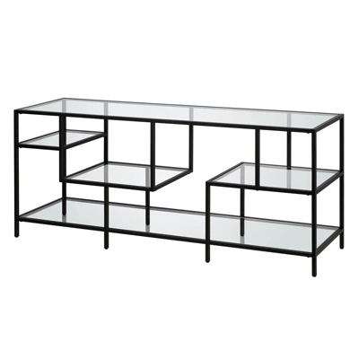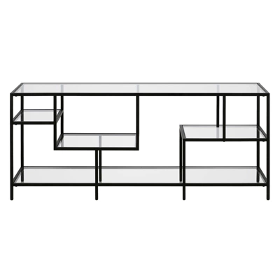 Combine functionality and on-trend design with this sturdy yet fashionable TV stand. Its tempered glass top and shelves are offset by your choice of neutral metallic finishes. Etagere-inspired shelving creates visual interest and provides an artful backdrop for your media collections or decorative items. Go modern in Black Bronze or glam in golden brass to elevate your entertainment space.Features : Accommodates TVs up to 65″Hand crafted Black Bronze finish is applied to the steel frame.Features a tempered glass top and shelves.Weight capacity is 75 lbs. on top, 20 lbs. on middle shelf, and 50 lbs. on bottom shelf.Features easy assembly.Clean with a soft, dry cloth; no harsh chemicals or abrasive cleaning materials.Specifications : Product Weight : 74.10 lbs