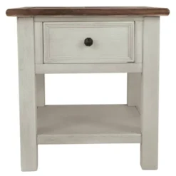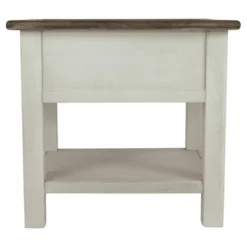 Display and contain your favorite things with this end table. Its textured antique white finish creates a vintage two-tone look, while outlets and USB ports provide functionality. This is a piece you will enjoy for years to come. Made with select hardwood solids and white oak veneers in a weathered gray finish. Paint grade materials form the base and finished in an antique white color. Signature Design by Ashley is a registered trademark of Ashley Furniture Industries, Inc.