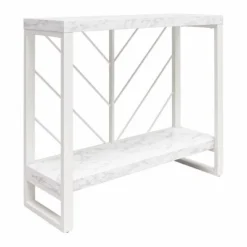 - The Console Table ships in one flat box and requires minimal assembly. Two adults are recommended to assemble. Assembled measurements: 35.43" W x 30.15" H x 11.8" D. Top shelf can hold up to 50 lbs. Bottom shelf: 30 lbs. Assembled weight: 35.8 lbs.