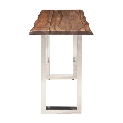 As a focal point in your entry or to put behind your sofa with lamps and photos, this Console Table will make a definite statement! The multi-hued grains of rich Sheesham wood have been enriched by our Brownstone Nut Brown finish, and flow over the top and live edges, giving it a distinctive look all it’s own. Polished stainless steel U shaped legs gleam with a mirror-like sheen for an overall reflective appearance that will fit perfectly with your eclectic decor. Use in conjunction with the matching End and Cocktail Tables for a stunning presentation.