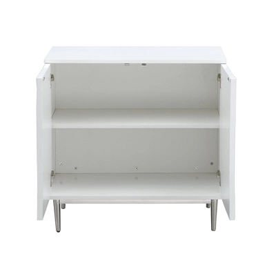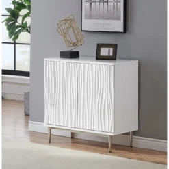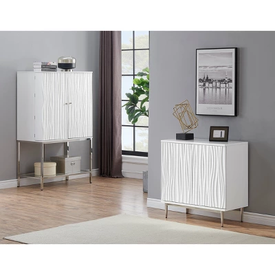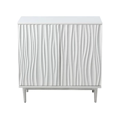 The play of lights and shadows emphasis the highly textured sinuous patterning that flows down the front of this stunning Two Door Cabinet. Finished in our Waves Glossy White with polished chrome legs, this Cabinet has a modern flair that will provide you with the perfect platform for showcasing your art on the roomy top, as well as a wonderful place to store your supplies in the shelved interior.