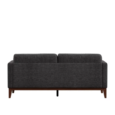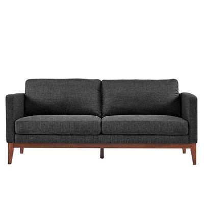 Add stylish seating to your living space with the Clyde Linen Upholstered Sofa by Inspire Q. The sofa features a sleek silhouette with slightly tapered legs for a quintessential mid-century aesthetic. The base has a rich walnut wood finish for a touch of contrast and a luxurious feel.