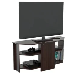 TV Stand by Inval finished in a rich “Espresso” laminates in durable melamine which is stain, heat and scratch resistant. This modern designed TV stand has a very functional modern design to accent your home décor. It accommodates up to 60″ flat-screen TVs with a maximum TV weight of 60lbs. The unit features open storage areas to showcase your A/V equipment and two storage compartments with adjustable shelves concealed by doors with brushed metal knobs, as well as easy management cable pass through.