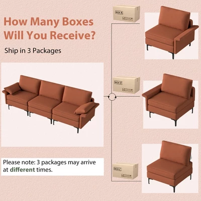 - What You Will Receive: This sectional sofa is packaged in 3 boxes– box A contains the left seat, left backrest, left armrest, legs and the box b includes right seat, right backrest, right armrest, legs. As for the middle armless seat with metal back, it will be packed in the box C. These boxes may come at different times.