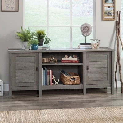 A functional and stylish piece, this TV stand Accommodates up to a 65″ TV weighing 70 lbs. or less. Great hidden storage behind doors for books, DVDs, and more and three adjustable shelves for varied storage options.