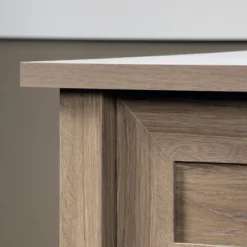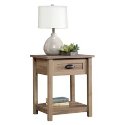 Give your home a touch of rustic beauty with this versatile side table from the County Line collection. This charming end table makes the perfect couch companion so you can stop setting your drinks on the floor while you watch the big game. Its spacious top surface provides you with room for all your must-have items like an accent lamp, your smart phone and a refreshing ice-cold beverage. It features a large storage drawer that opens and closes on smooth metal runners for easy access storage. It also includes an open shelf for additional storage space. It is finished on all sides for versatile placement in the living room, the entryway, or standing alone as an accent piece. Finished in Salt Oak and detailed with dark Spanish hardware, this do-it-all table is just what your home needs.
