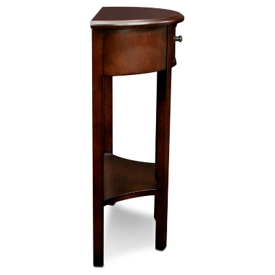 This soft silhouette is perfect for that tight area in a hallway or stair landing. Go ahead and brush by there are no corners to bump. A single drawer with blackened metal pull hardware for the things you don’t want to see and a lower display shelf for the things you do.