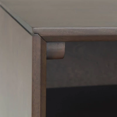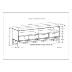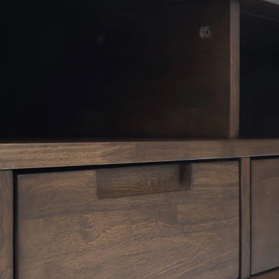 - 2 inch MetalHand-finished wood with a Walnut Brown stain and a protective NC lacquer to accentuate and highlight the grain and the uniqueness of each piece of furnitureFeatures four (4 )drawers with metal drawer glides and two (2) large open areas for your media devices