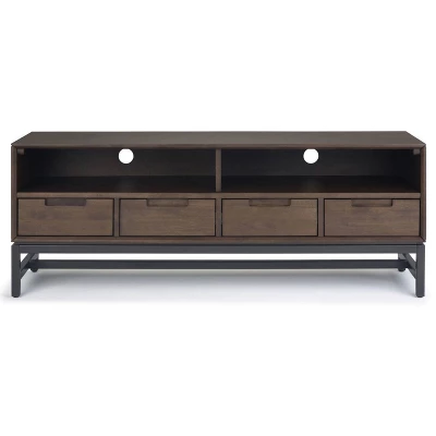 The Devlin Collection is made from richly-grained solid Rubberwood. This mid-century modern industrial collection has a clean angular metal base, with square, simple modern drawer and table top. With no visible hardware, and only simple wood pull handles, the solid Rubberwood top, is simple and uncomplex. The Devlin 60 inch Low TV Table has four working drawers with full extension ball bearing drawer glides, and an open storage area for your media devices to maximize functionality. The 60″ width is perfect for TVs up to 65 inches and gives you lots of storage possiblities. The Devlin collection includes coffee, console, end tables, tv stands, sideboard buffet, desks and bookcase.