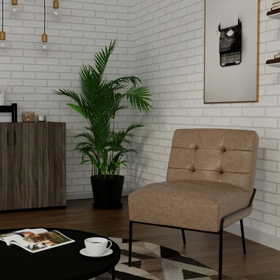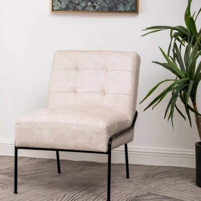 This living room accent chair will add a modern touch with its sleek metal frame and beautiful upholstery. The stain resistant fabric is as smooth as it is stylish and comfortable. Offered in leather, velvet, and other upholstered fabrics to fit any style. The pintuck feature will add a level of sophistication that will awe your guests. Built with a metal foundation this bedroom accent chair is foolproof for any family member or guest. Easy to assemble and ready in minutes.