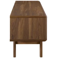 Elevate your entertainment decor with the Envision 44″ TV Stand. Featuring an elegant linear silhouette, Envision comes designed with a sliding white door for concealed and open storage space, height adjustable shelves on either side for your game system, DVD or Blu-ray player, and walnut grain veneer over durable fiberboard for reliable support. Supported by flared and tapered legs, update your living room decor while keeping your visual space clean with this versatile TV stand. Accommodates flat screen TVs up to 47 inches.