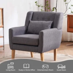 Enjoy the classic button tufted design accent chair with stylish decoration and comfort to any space. High-quality foam cushion and classic arm rests provide you a rest after a busy day. The chair is upholstered in a soft and durable micro faux-linen fabric that is easy to clean and maintain. Include an extra soft lumbar pillow, providing extra comfort and lumbar support. Solid rubberwood legs stand stably and firmly. Upholstered chair matches perfectly with your home decor.