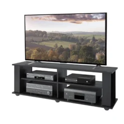Enhance your living space with the contemporary design of the FS-3580 TV Stand from the Fillmore Collection by CorLiving. Enjoy the generous open storage space perfect for housing all of your A/V equipment, complete with adjustable shelves to customize your look. The open design provides ample storage space and crucial breathing room for all of your high valued electronics allowing them to perform at their full potential. Complete in our signature Ravenwood Black finish this transitional stand can accommodate most 48″-75″ TVs. Bring home this contemporary furniture by CorLiving.