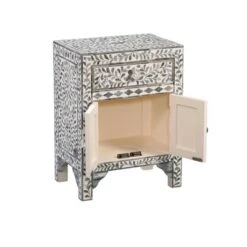 Expertly crafted in India, the Fowler Accent Cabinet is the epitome of exotic beauty, refined polish and simple practicality. It dazzles in lilac gray with a floral vine motif of hand-inlaid bone. From the delicately scalloped legs to the handy drawer and cabinet, it is sturdily made of mango wood. A versatile piece, the Fowler can be used as a side table, nightstand, or accent chest.