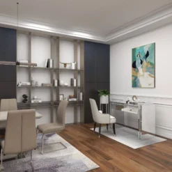 - Precisely cut glass mirrors and rhinestone accent outline details adorn this desk for a grand and polished look