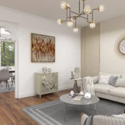 - •Glam accent cabinet with 2 doors is crafted of wood and glass mirror