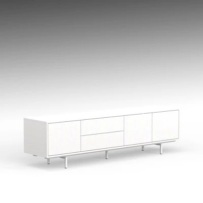 The Atlas TV Console demonstrate that classic, high-end design, does not require a high-end price tag. Designed specifically to fill a void in the furniture market, the Atlas collection offers durable, functional, and beautifully clean lines at an afforable price point. Constructed from furniture-grade engineered hardwood and finished with a water-resistant and stain resistant melamine finish designed to withstand everyday use with ease. With unmatched finish options the Atlas 78″ TV Console accommodates most TVs with screens upwards of 90 inches while providing plenty of storage space for your AV equipment, gaming devices, and media. Despite its affordable price tag, the Atlas is built strong. A steel base anchors the piece while the cabinet above easily supports 175lbs of weight on its top. Strategically located cable management allows you to easily house and use your AV equipment. Shipped in two lab certified ISTA 6A packaging (this ensures your furniture arrives in pristine condition), assembly takes about an hour for one or two people.
