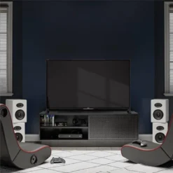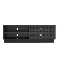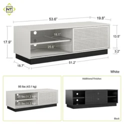 Go from n00b to true gamer with the NTense Glitch Gaming TV Stand. This TV Stand can hold most flat screen TVs up to 60” wide or up to 95 lbs. Made of painted MDF with a powder-coated metal sliding door, the finish pairs with the glass middle shelf and RGB lights for a contemporary look. The metal sliding door creates both open and concealed shelves that still provides proper air circulation for all of your equipment and features wire management to keep your cords organized. The glass middle shelf and LED lighting are perfect for any gamer ready to take it to the next level. The TV Stand ships flat to your door and 2 adults are recommended to assemble. The TV Stand can hold up to 95 lbs. Each shelf can hold 25 lbs.
