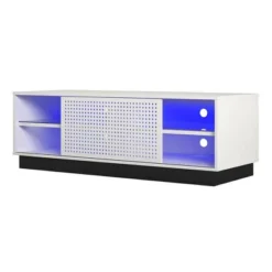 - Made of painted MDF with a powder-coated metal sliding door, and glass middle shelf and RGB lights for a contemporary look