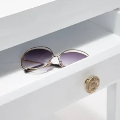- Crisp white painted solid wood with gold hardware