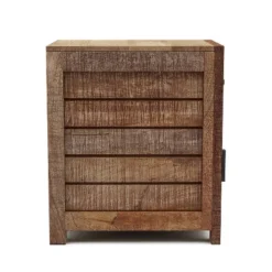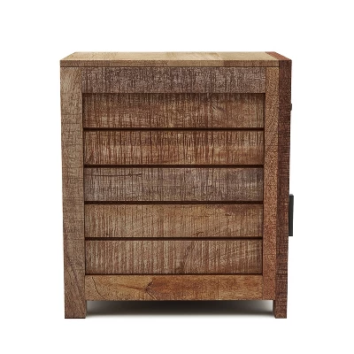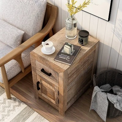 Enhance the rugged ambiance of your living area, home office, or bedroom with this one-drawer side table. Rustic touches complement plentiful storage options that include a one-door cabinet. Natural finish solid wood construction adds to the rough hewn look, which is complete with simple bar pulls on both the drawer and door. Tuck essentials like remote controls or books out of sight in any room.
