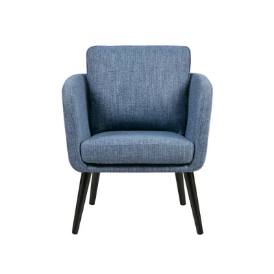 Elevate your living space with the refined style of the INK+IVY Jake Accent Chair. This accent chair flaunts rich blue upholstery with a loose back pillow to provide additional comfort and create a sophisticate mid-century look. The solid wood legs showcase a black finish that adds a bold and complementary touch to the lounge chair’s design. Leg assembly is required. 1 Accent Chair:28″W x 29.5″D x 34.5″H
