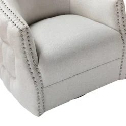 The swivel chair with a curved and ergonomic design is a stylish and comfortable seating option that combines functionality with elegance. Its barrel-shaped construction embraces your body, providing excellent support and comfort. br>The chair is adorned with decorative nailhead trims, adding a touch of sophistication and flair to any space. The button-tufted outside back adds a classic and refined look to the chair.