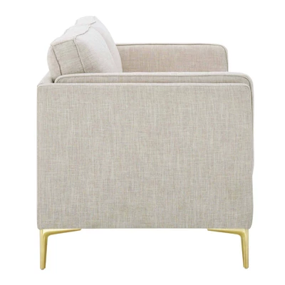 Invigorate your living space with rich tactiles and retro modern charm with the Kaiya Fabric Sofa. Putting a contemporary twist on a classic mid-century modern design, this living room sofa features subtle French piping detail, a tailored profile, and gold metal accents. Covered in soft polyester fabric, this upholstered sofa is padded with dense foam and complete with a sinuous spring support system to offer a premium seating experience. Resting on gold metal legs with non-marking foot pins, this fabric sofa features a solid wood construction for lasting durability. Assembly required. Sofa Weight Capacity: 900 lbs.