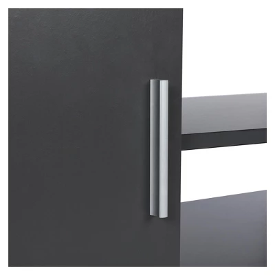 Elevate your entertainment space with the great-looking contemporary Room & Joy Kimmel TV Stand. Designed to accommodate up to a 70″ flat screen TV up to 120lbs., this TV Stand creates a sleek and stylish showcase for your home theater system. The TV Stand features multiple open shelves for numerous audio components. Two side cabinets provide additional concealed space for storing movies, music, video games, gaming controllers and other items. The Carson allows you to run wires easily and neatly through the large wire management holes in the back of the unit to keep all your components tangle free. The clean lines of this TV Stand and the matte black finish with silver metal accents makes this piece stand out in any room. After fully assembled, this stand is 20.5″H x 63″W x 15.75″D and is recommended to be assembled by 2 adults. This TV stand is constructed of particleboard and metal for a look that fits in with modern day style.