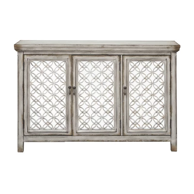 Need a little extra storage in your dining or living room? We have you covered with this credenza. crafted in our weathered Lizzy Hazy Gray finish, it delivers a French country feel in any space, especially with its detailed fretwork panels with mirrored insets. Inside, this piece features two fixed shelves, so it gives you ample storage for all of those space dining linens and extra plates.
